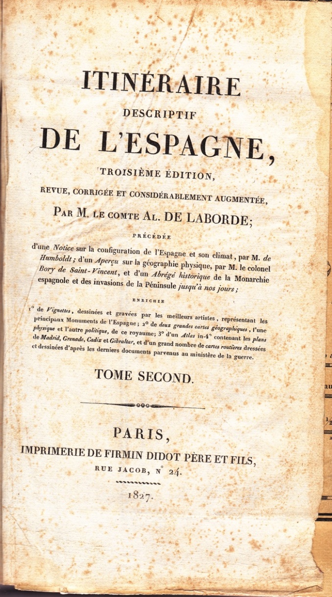 ITINERAIRE DESCRIPTIF DE L`ESPAGNE ET TABLEAU ELEMENTAIRE DES DIFFÉRENTES BRANCHES DE L'ADMINISTRATION ET DE L'INDUSTRIE DE CE ROYAUME, Alexandre de Laborde, 1808-1809. (Completado).