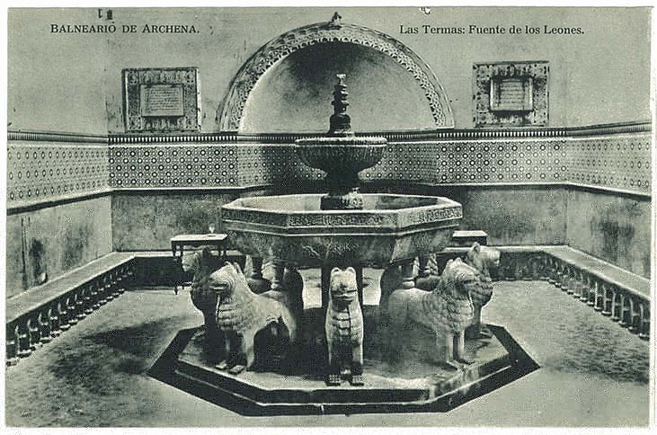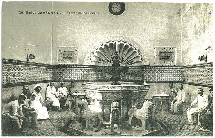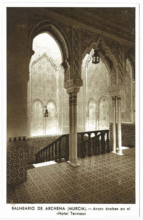 Además también me mandó 3 postales del Balneario de Archena, en Murcia. Dos de ellas (años 30...una está escrita aunque no tiene sello), son de la misma sala que reproduce una copia de la fuente de Los Leones. Como me hizo notar Baumar, las fotos tienen que estar hechas con un desfase temporal importante porque hay cambios significativos en el suelo de la sala y en la decoración de la concha. La tercera postal es del hotel Termas, Archena; la escalera y arcos de estilo mozárabe nos recuerdan sin duda a La Alhambra. Muchas gracias!