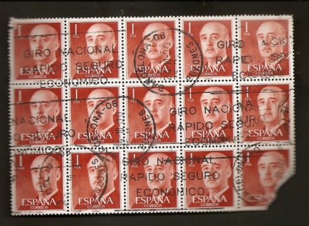 Aquí un bloque de 15 sellos de 1 pta., algo perjudicado, con rodillo manual de BARCELONA/BUZONES del 24.10.2000, que tendré que regalar a un chino que conozco. El euro se veía venir y las casas filatélicas se deshacian de todo su stock de sellos para franqueo.