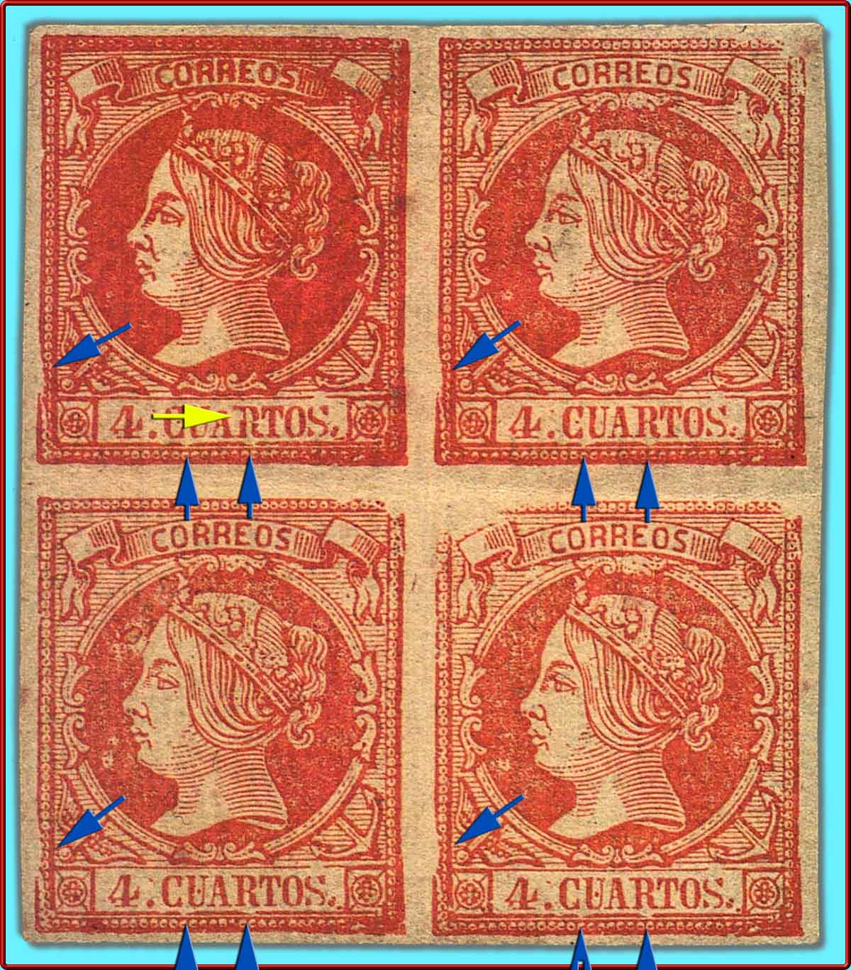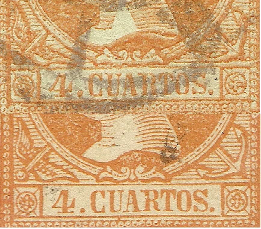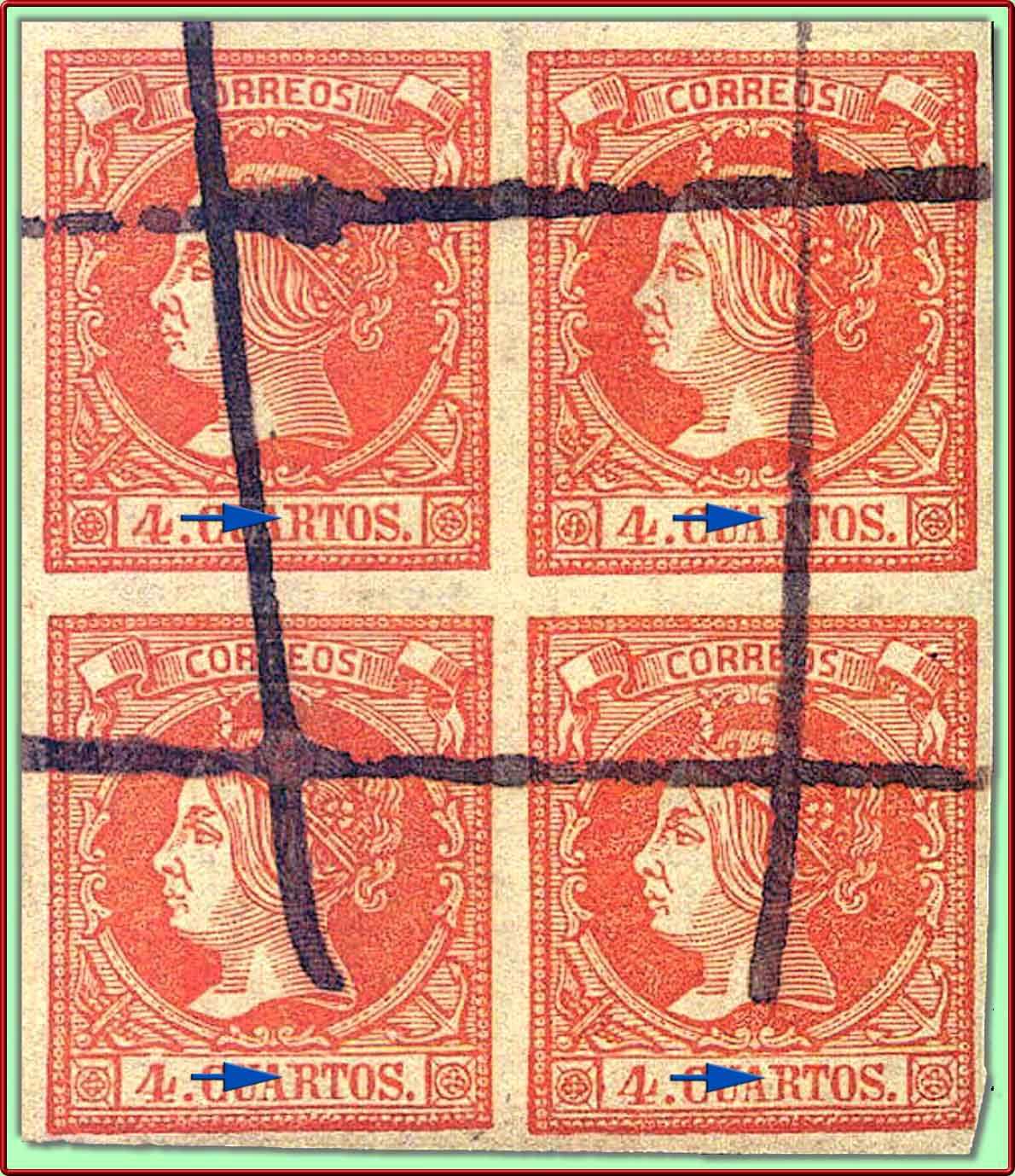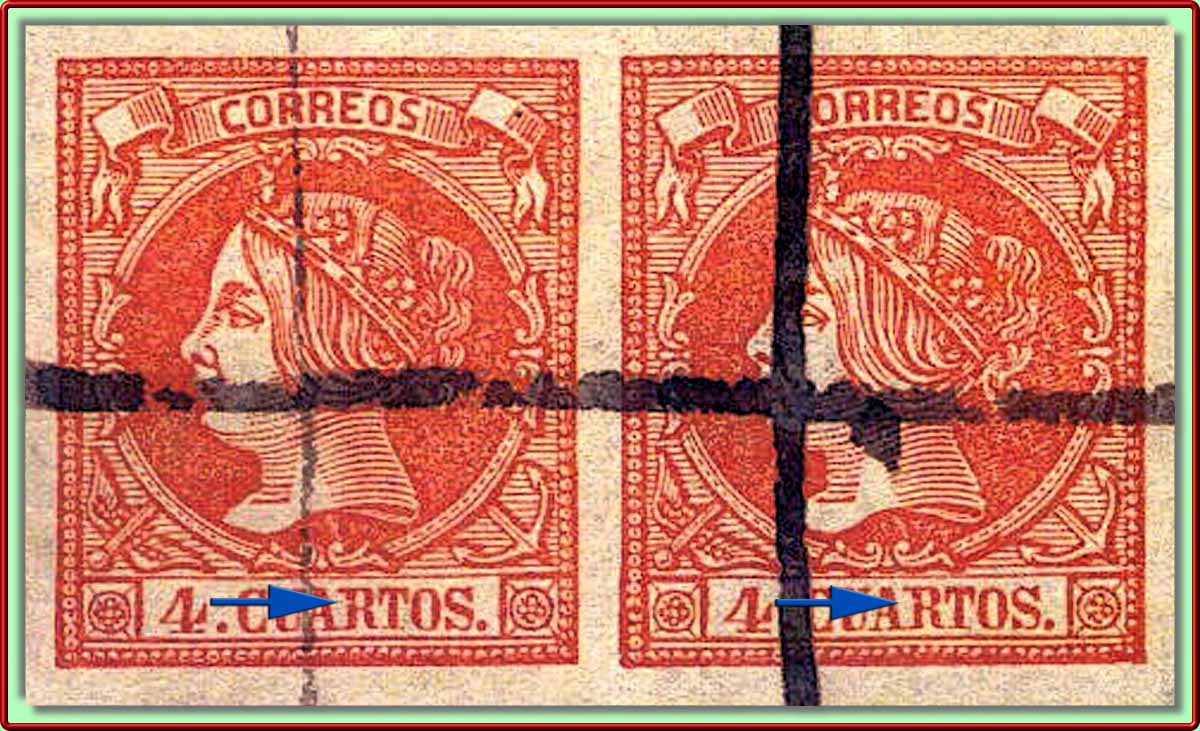 De este Tipo aporto una pareja vertical con los detalles de identificación marcados con flechas de color azul más el detalle de una curiosa hendidura en la letra R en el sello superior señalada con una simpática flecha (de color verde para no confundir) ...