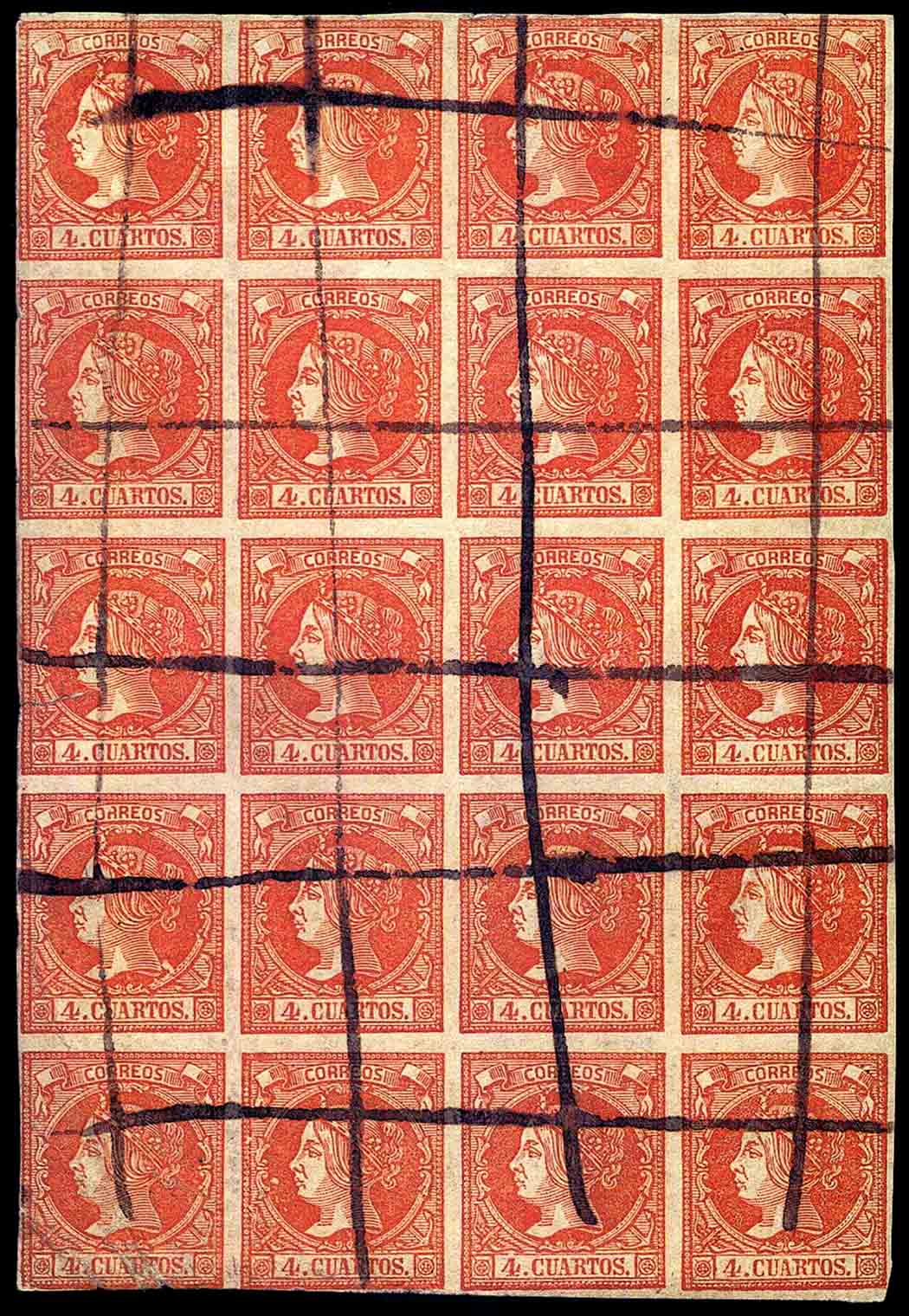 Para finalizar, el bloque de 20 ejemplares todos con sus R con hendiduras, unas más que otras, de las que me he ahorrado las flechitas de rigor ...