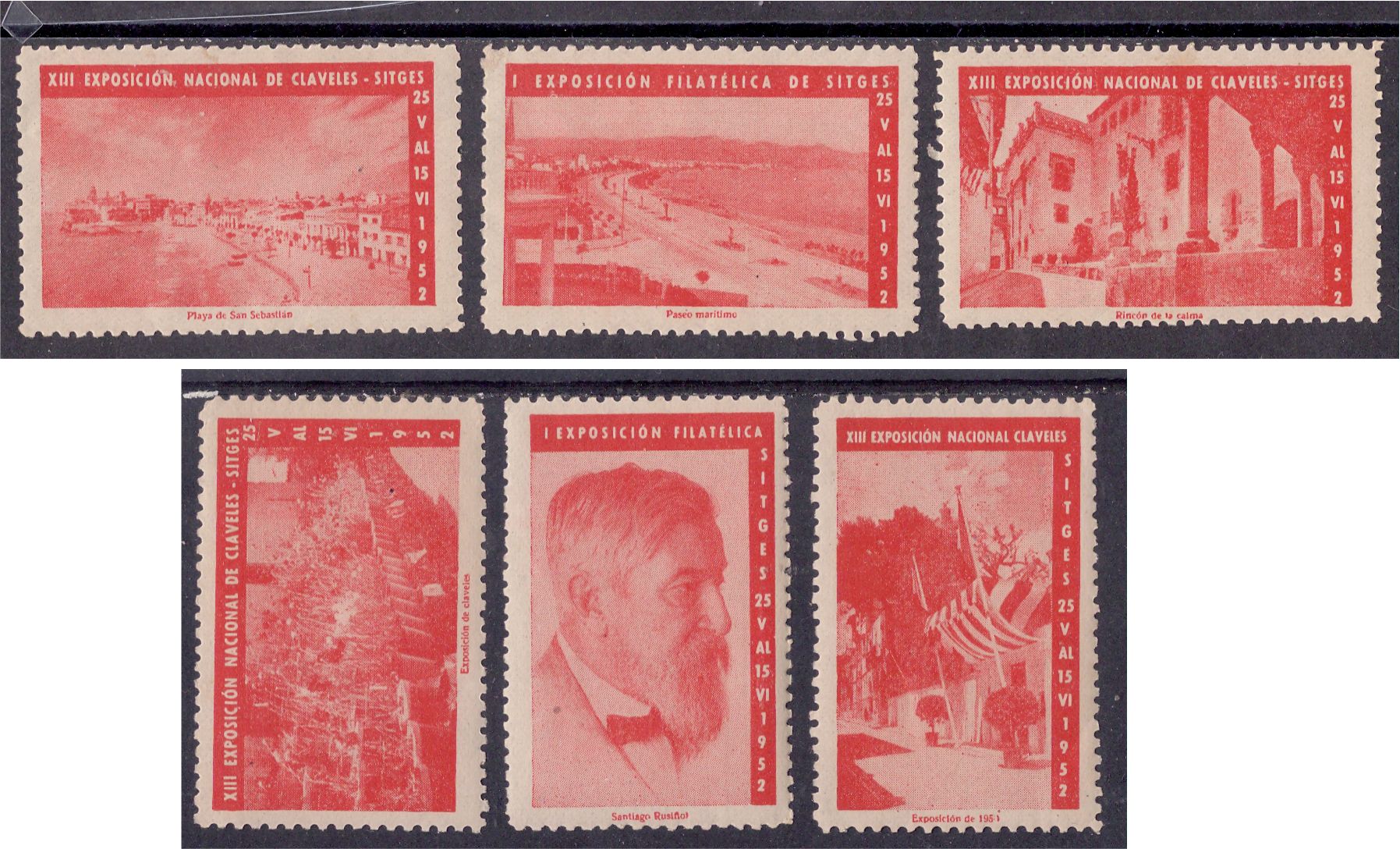Fomento del Turismo de Sitges editó en 1952 unos pliegos de 16 viñetas para la XIII Exposición Nacional de Claveles y I Exposición Filatélica, realizados en la imprenta F. Carreras de Granollers.