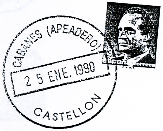Traigo aquí este fechador fuera de norma del apeadero de Cabanes, en Castellón, del hilo de Estaciones y enlaces.