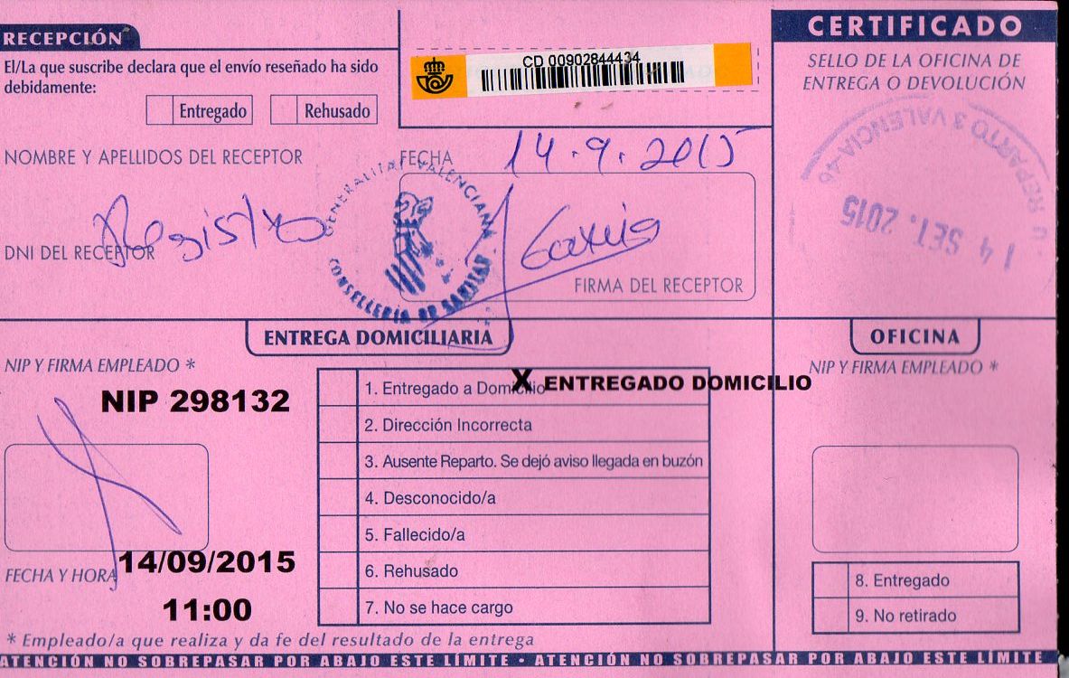 Muestro un Aviso de recibo enterito, con un fechador impreso de la UR 3 de Valencia.