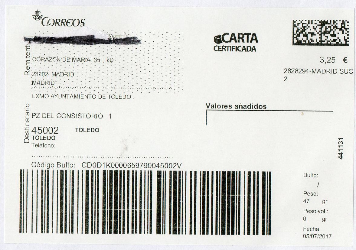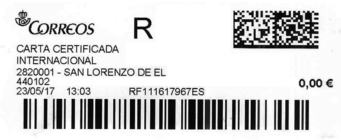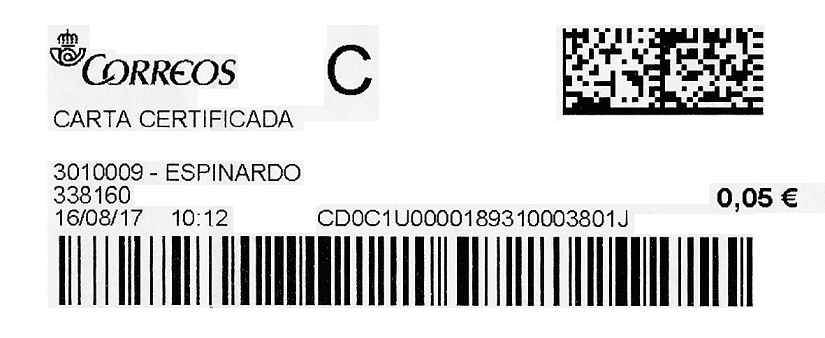 Además, está el tamaño de la etiqueta, grande, algo inusual para las cartas certificadas, salvo que la indicación de los servicios adicionales (asegurado y P. E.E.) así lo requiera.