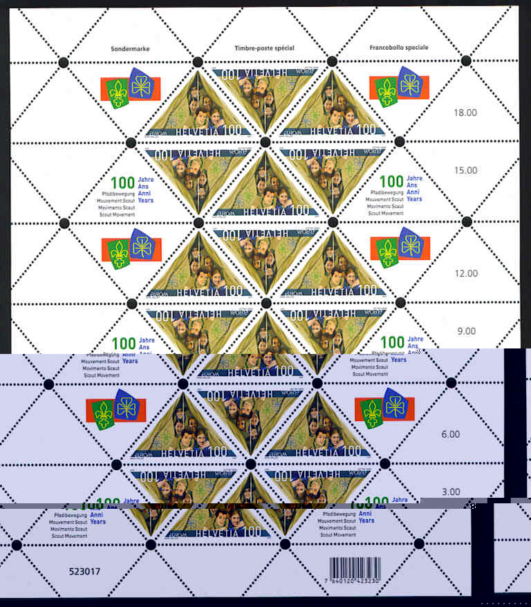 Entre la multitud de sellos emitidos en 2007 para conmemorar el Centenario del Escultismo, aprovechado por los correos de todo el mundo mundial para ganar pasta gansa, Suiza consideró conveniente hacer un único sello, triangular. Un sello bonito, original y muy moderno. Claro, que el pliego tambien es muy original. Y algunos hemos picado