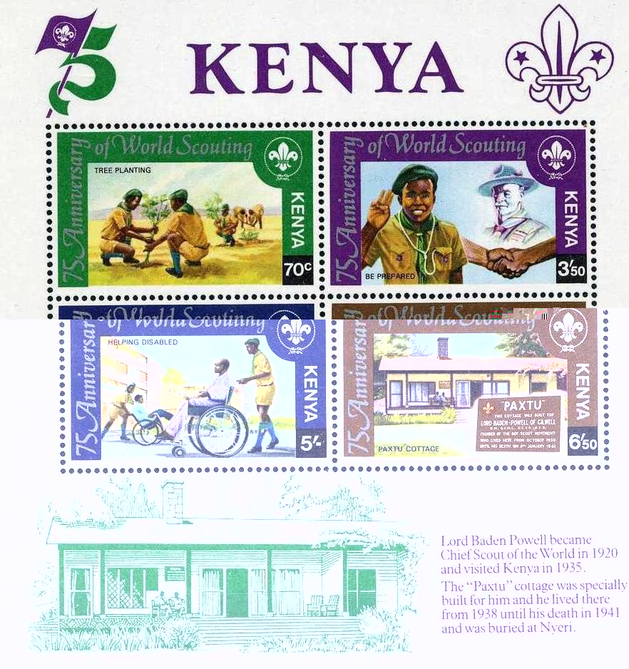 Hoy, 8 de enero, se cumplen 70 años de la muerte de Baden Powell. Pasó sus últimos años en Nyery, Kenya, viviendo en la casa llamada Paxtu. Esta hoja bloque tiene elementos temáticos propios, el dibujo de Paxtu, que la hacen más interesante para añadir a una colección.