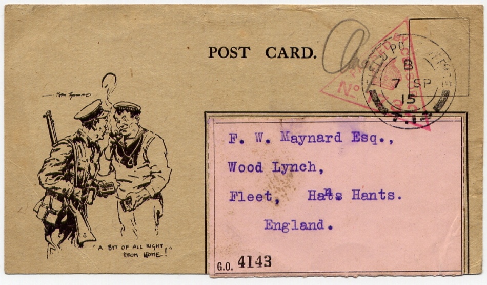 1915 (Sep) 'A Bit of all right from Home!' illustrated tobacco card to GB with FIELD POST OFFICE T14 and censored 3/1732 allocated to 42 Field Ambulance.