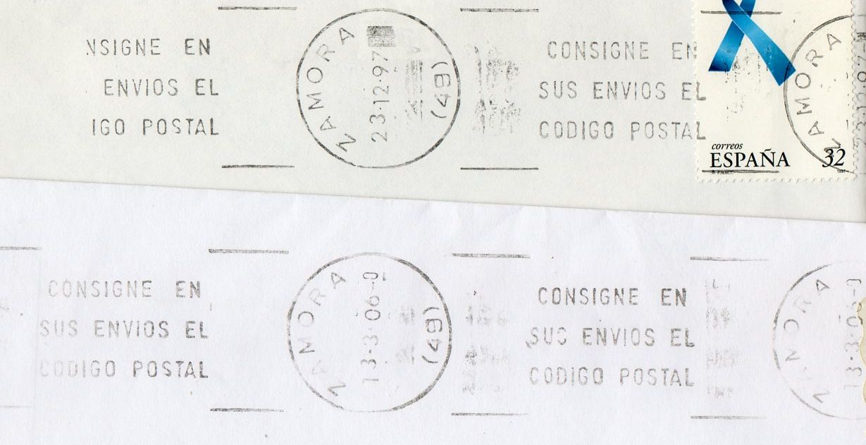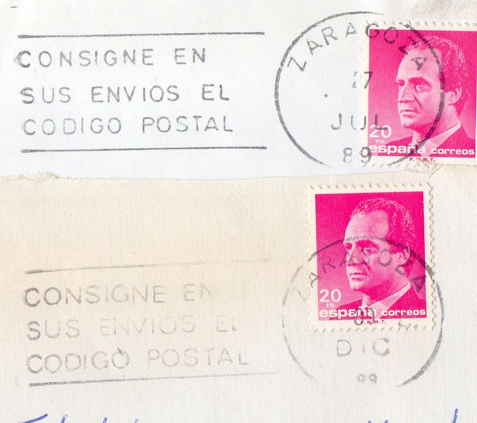 Las leyendas no son iguales y los diametros (29 mm tipo) del circulo de los fechadores son diferentes, aunque puede ser una deformación por presión (27 mm). Muestro los dos:AF-06 ZARAGOZA (2).jpg