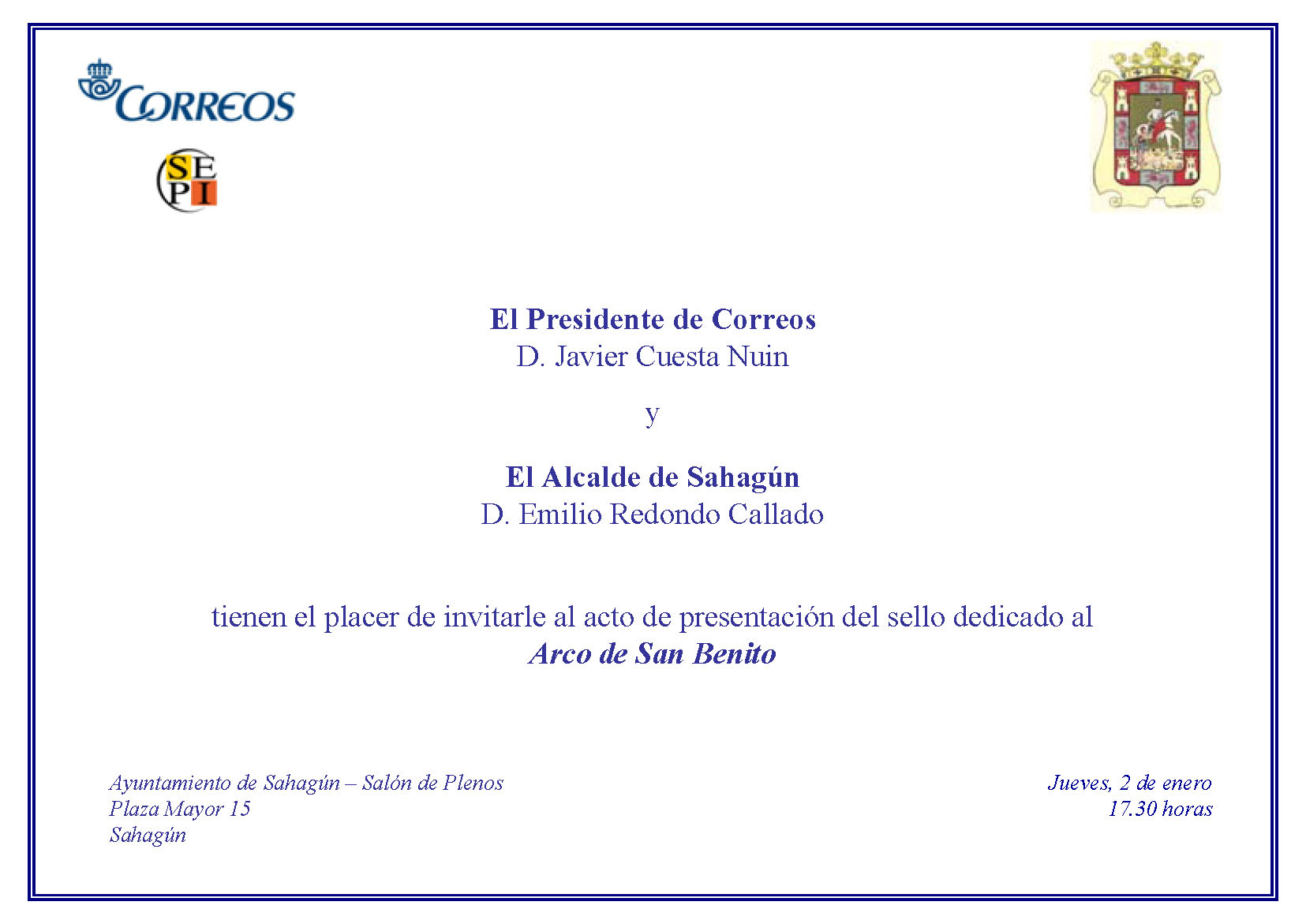 Reproduzco la invitación que ha cursado el Presidente de Correos, Javier Cuesta Nuin, y el Alcalde de Shagún, Emilio Redondo Callado.