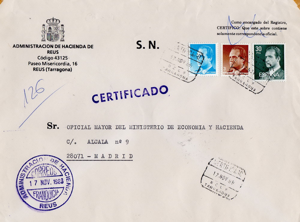 Una carta certificada de la ADMINISTRACION DE HACIENDA de REUS ( Tarragona ) en 1988