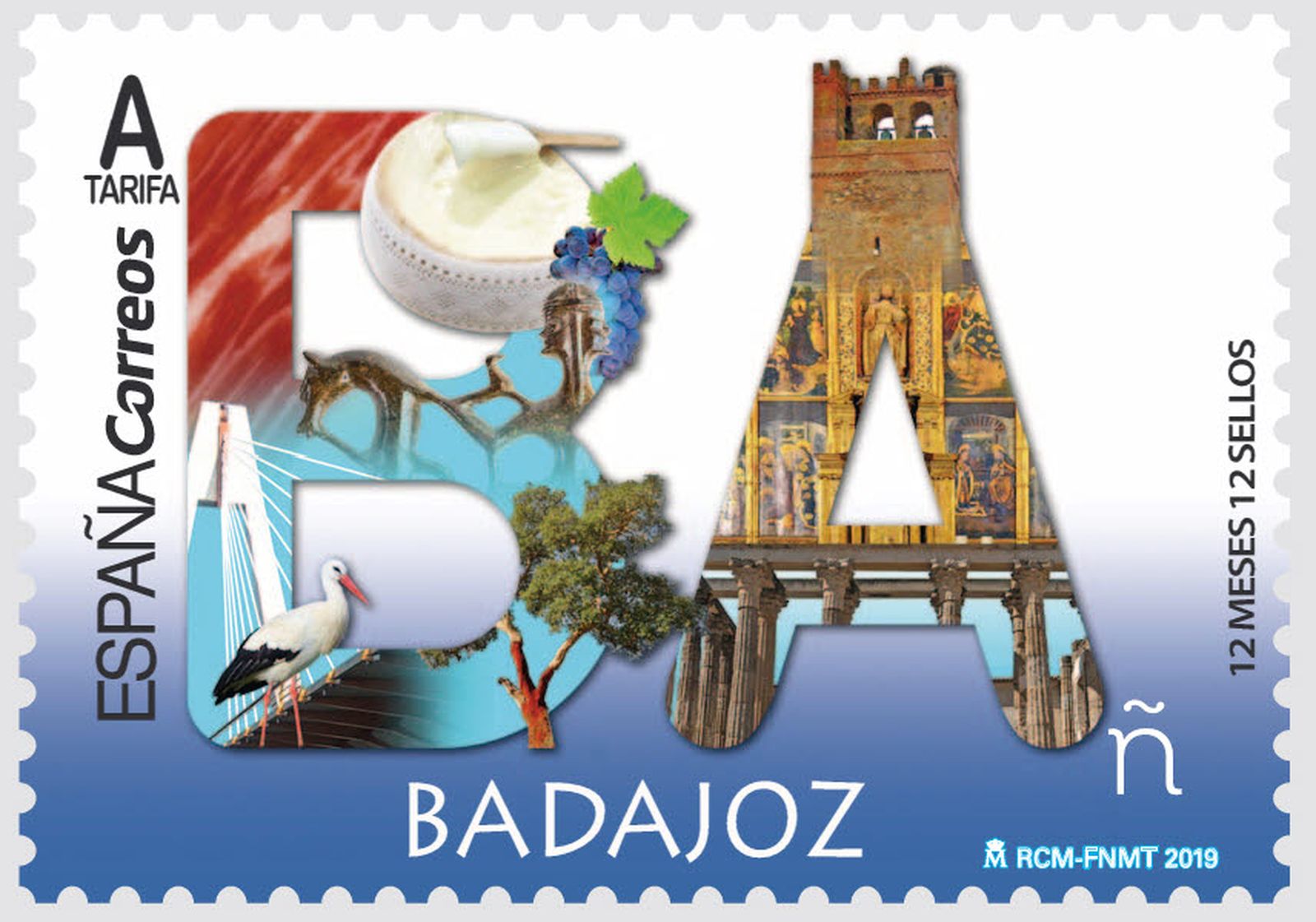Dentro de la serie denominada «12 Meses 12 Sellos», el pasado día 1 de febrero de 2019, se ha emitido un sello de correo autoadhesivo dedicado a «Badajoz».