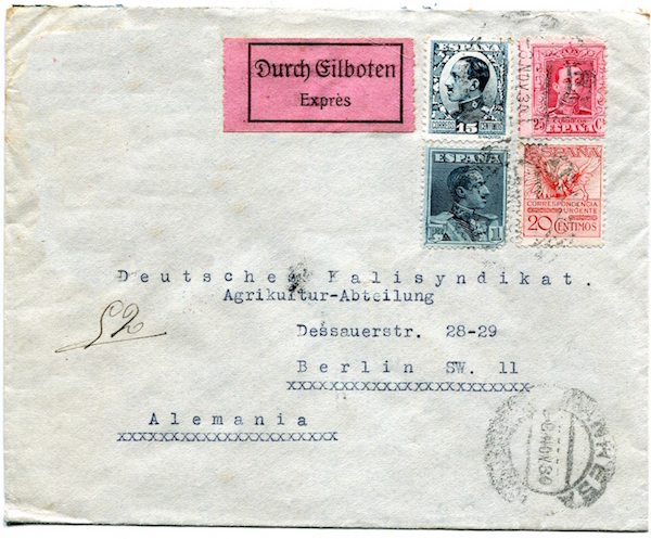 En fin vamos a lo nuestro. La etiqueta la podía haber quitado, pero, no lo he creído conveniente, ya que es muy posible que siempre estuviese allí, al disponer de ellas el remitente. Me explico, con el borrado de los sellos he dejado en blanco aquella zona del sobre, zona que posiblemente haya el membrete del remitente. Lo primero que me llamo la atención de este sobre, es que no había dato alguno del remitente, cosa extraña considerando las características del envío y el destinatario «Un sindicato importante relacionado con la potasa» al departamento de agricultura (Agrikultur-Abteilung).