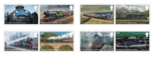Royal Mail :Reino Unido: ocho sellos que honran el viaje de 100 años de la locomotora de vapor más famosa del mundo.
