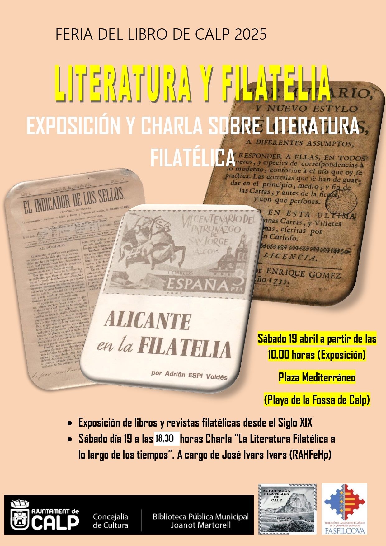 Este año, la filatelia calpina va a participar en la Feria del Libro de Calpe que se celebrará durante los días de Semana Santa, en un enclave excepcional como es la conocida Playa de la Fosa de Calpe (Plaza Mediterráneo), por donde son muchos los turistas que pasan. Y lo haremos con una exposición de literatura filatélica y una Charla a cargo de José Ivars Ivars, bajo el título "La Literatura Filatélica a lo largo de los tiempos".