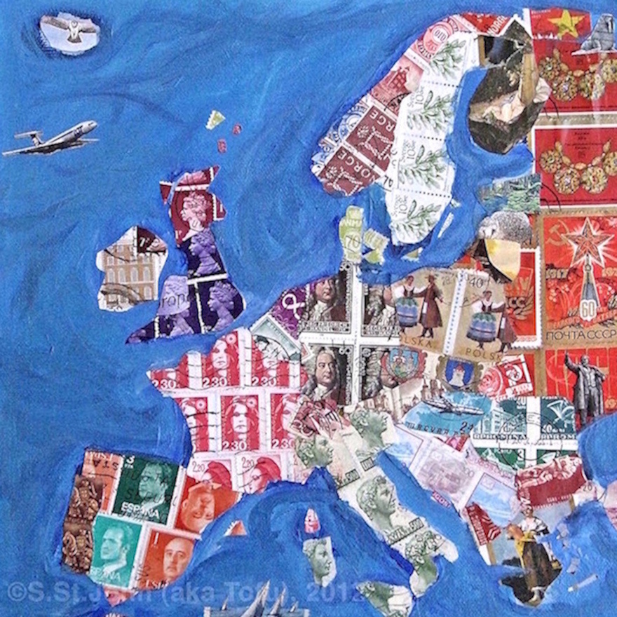 Seguimos viendo los distintos subgrupos temáticos de la primera de las clases descritas de arte con sellos; la de representación de figuras silueteadas rellenas con sellos, una clase fácil y que puede hacer cualquiera. Nos habíamos quedado en la representación de países y hoy, sin salirnos de ese apartado, muestro algunos ejemplos de cómo la representación de la geografía de los países se ha extendido a la representación de continentes, en un juego que suele consistir en la utilización de sellos de cada país para representar el mismo.