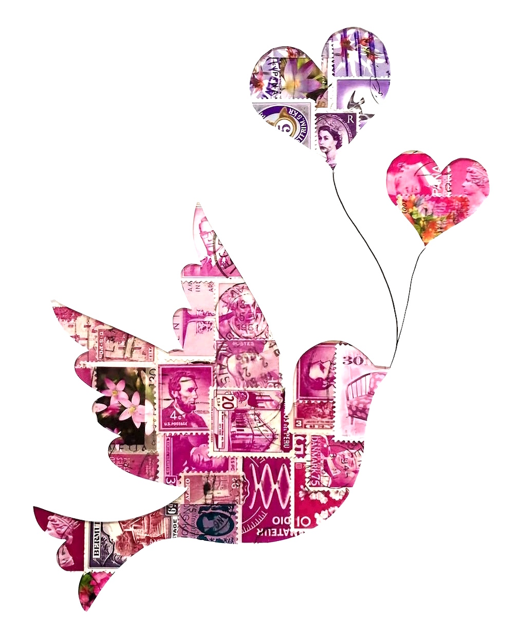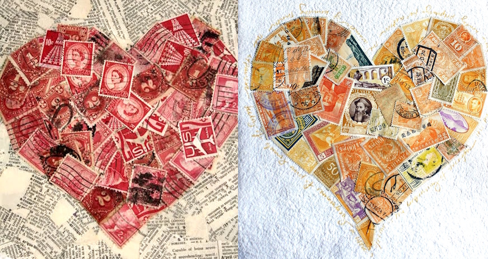 Una de las representaciones que más se ve en la red de la construcción de siluetas con sellos, si no la que más, es en la que se construyen figuras de corazón con los sellos. Probablemente sea porque es una de las figuras más básicas (y fáciles) de representar y porque los corazones transmiten simbólicamente afecto, cariño, amor, pasión y muchos de los elementos que se han transmitido históricamente a través del correo. Yo confieso que de esta exposición de figuras silueteadas con sellos que estamos haciendo en esta parte del tema no he hecho nunca ninguna de las anteriores ni de las siguientes que se vean, con la excepción de los corazones.