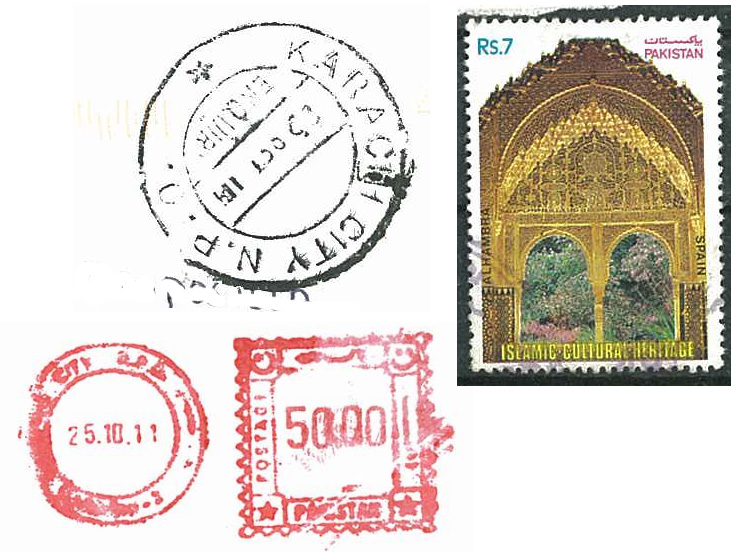 Hola, he conseguido el siguiente sello, comentado por alguerrero en un post hace unas semanas. Llega directamente desde Pakistán, os enseño también el matasellos del sobre...