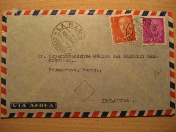 Los de 1 pta. rojo y 2 ptas. púrpura, en carta de La Rambla, Córdoba, año 1956 a G. Bretaña... con la marca romboide de recuento de cartas usada en aquel país.