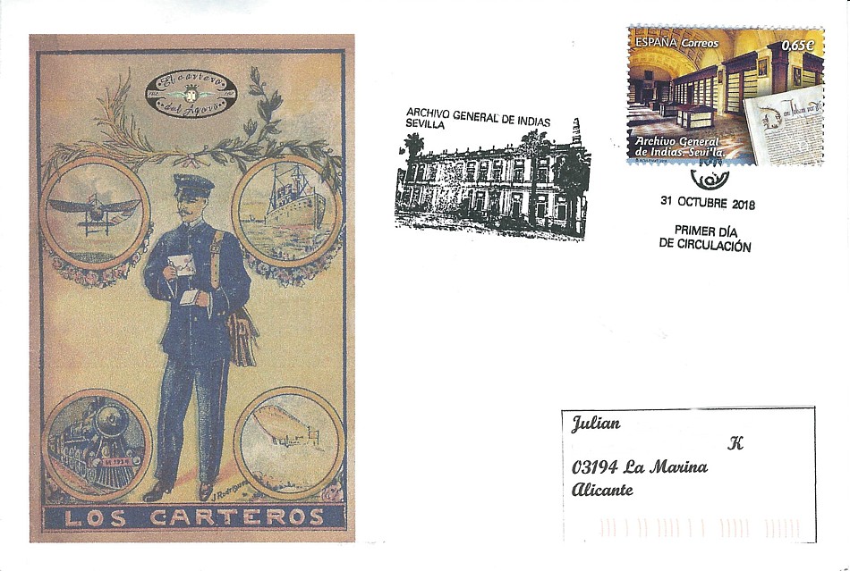 Recibida de El Cartero del Ágora, carta desde la exfilna de Sevilla con matasellos del Archivo General de Indias y con sus rayitas y números naranjas.