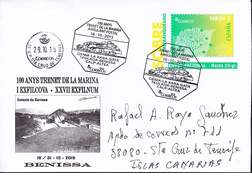 100 ANYS TRENET DE LA MARINA - AMBULANTE POSTAL - 16-10-2015 - (DENIA-LA XARA-GATA-TEULADA-BENISSA-CALP-ALTEA)