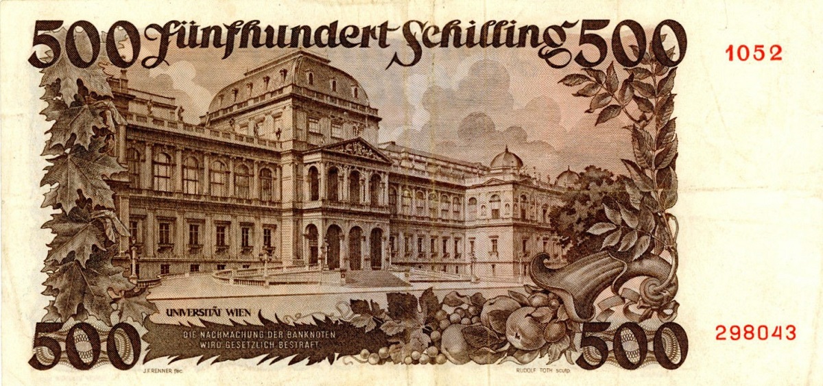 Así mismo, quisiera dejar constancia de los datos nuevos que voy encontrando sobre Rudolf Toth. Ya dijimos que empezó a trabajar para el National Bank, la casa austríaca de grabadores, a finales de los años cuarenta, y que además de sellos, de los que seguiremos mostrando más en las próximas entradas, también hizo grabados para billetes. Muestro aquí cinco de los que he podido localizar, a modo de información complementaria: