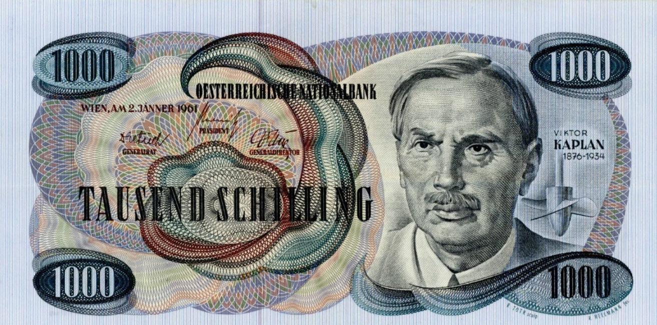 Y Austria, 1961, cara de un billete de 1.000 s., dedicado al ingeniero austríaco Viktor Kaplan:
