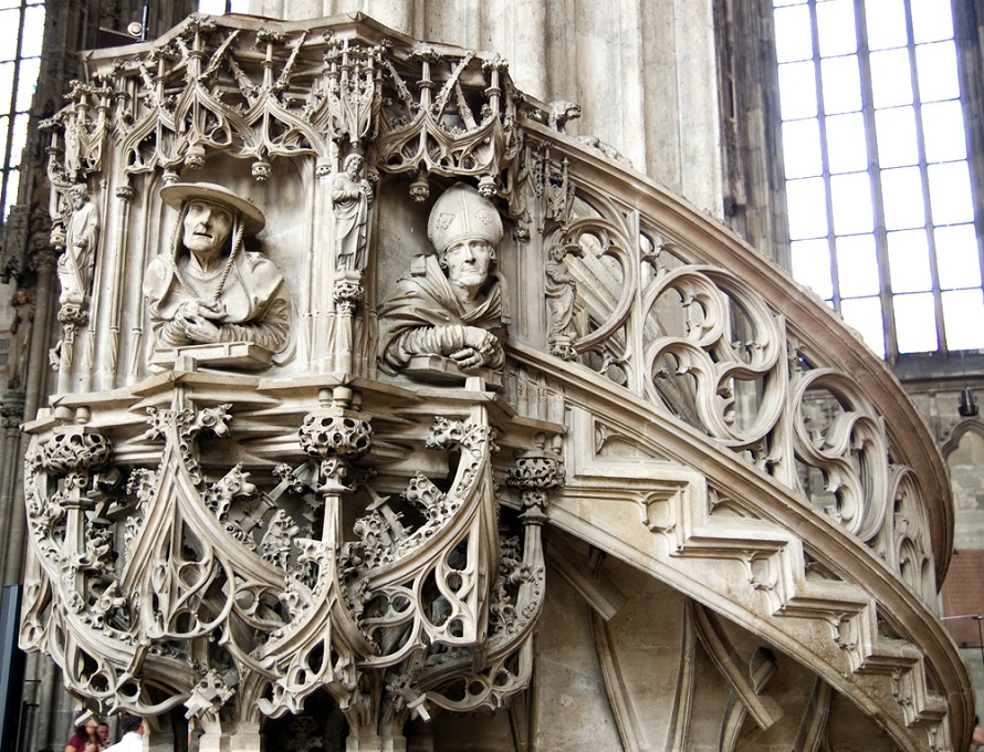 Uno de los primeros trabajos de Ranzoni en la posguerra, año 1946: majestuoso grabado de uno de los púlpitos elevados de la Catedral de Viena. ¡Excepcional!