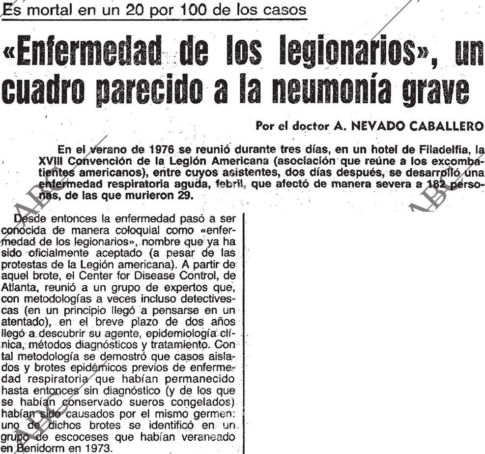 Unos 200 miembros de la Legión, hombres mayores muchos de ellos, hospedados en el hotel, presentaron bruscamente un cuadro de fiebre, cansancio, tos seca, falta de aire, confusión y rápido deterioro del estado general, con una mortalidad muy alta, de cerca del 20%.