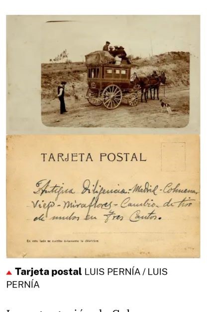 Aprovecho aquí a mostrar una imagen que algunos ya conocéis porque os la envié hace unos años, en formato de tarjeta postal y en la que vemos la Diligencia en un momento impreciso pero que podría corresponder a las primeras décadas del siglo XX. Esa “Diligencia” hacía el camino Madrid-Miraflores de la Sierra, y en Tres Cantos estaba el cambio de tiro de las mulas. Quiero adivinar que en esas grandes sacas que iban sobre el techo de la diligencia se guardaría también la correspondencia…