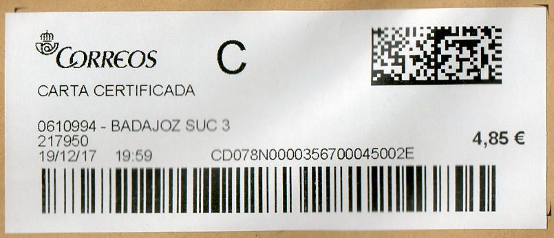 0610994-BADAJOZ SUC 3 / CARTA CERTIFICADDA / 19-12-17