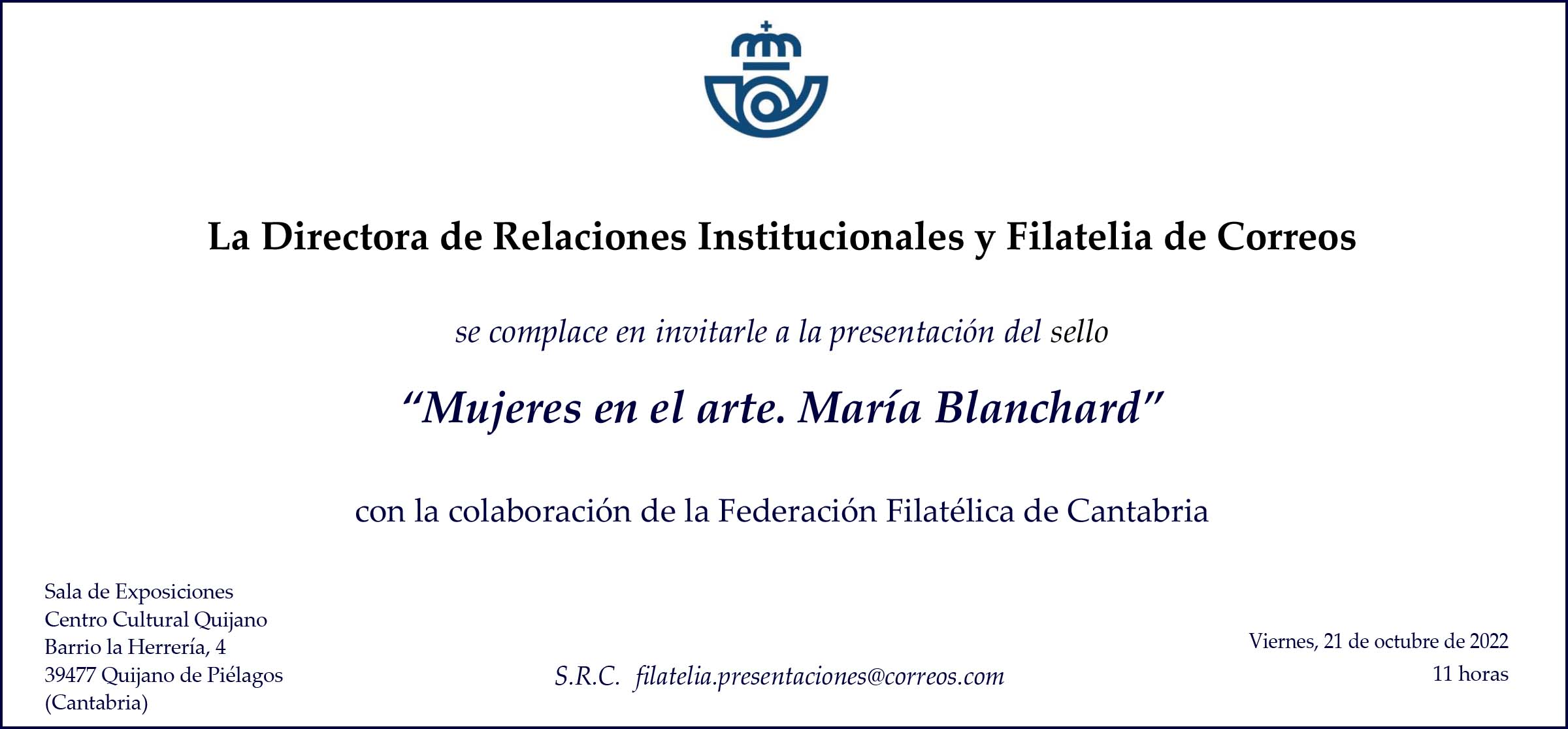 Nos complace invitarle a la presentación del sello “Mujeres en el arte. María Blanchard“, que se celebrará el próximo viernes 21 de octubre en Quijano de Piélagos (Santander).