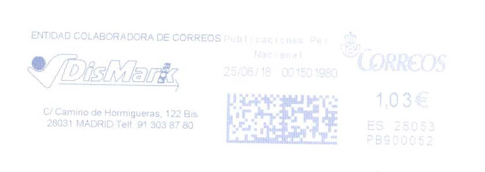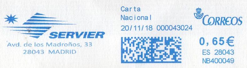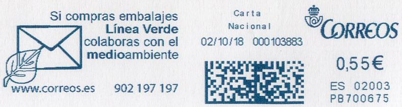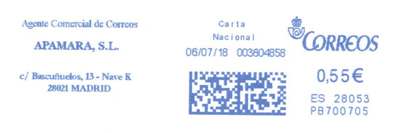 A día 30 de Junio de 2017 la máquina PB700485 de APAMARA, S.L causa baja por reposición...por la máquina PB700705 que lógicamente se da de alta y que el bueno del santo todavía no ha registrado en su magnifico catalogo(quizás esté en la zanja de las altas y bajas de estas máquinas y la base de datos de Rafa.....puff, creo que Luis necesita unas vacaciones...). Para confirmarlo subo una impronta de esta máquina, probablemente del mismo dia que se dio de alta) con 5113 ítems franqueados, contador bajo si tenemos en cuenta que la hermana PB700704 franqueaba mas de 10.000 improntas al día PB700704:Azul325.jpg