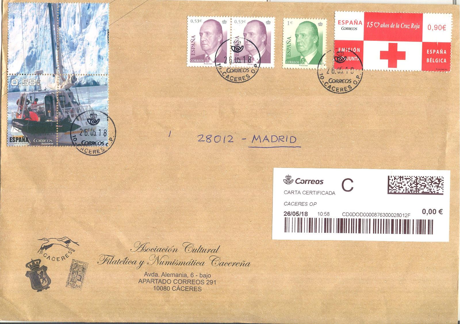 Muestro el sobre para que se vea el motivo del franqueo 0,00 y se compruebe que las entidades filatélicas, dando ejemplo, realizan sus envíos con sellos.