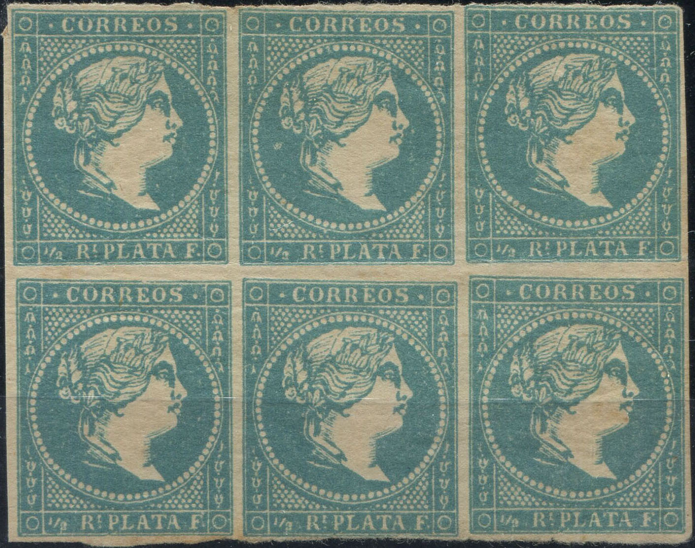 este es un bonito bloque de 6 de uno de los tipos de Falso Postal del medio real de Antillas Españolas.