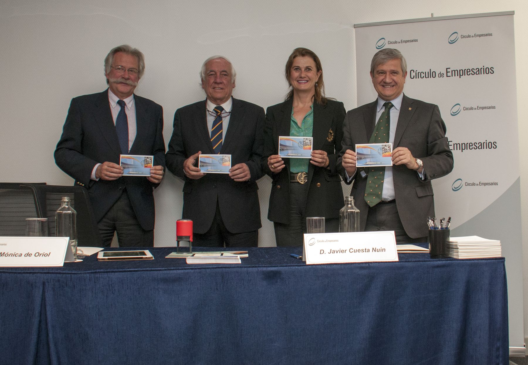 La Presidenta del Círculo de Empresarios, Mónica de Oriol, el Alto Comisionado del Gobierno para la Marca España, Carlos Espinosa de los Monteros, y el Presidente de CORREOS, Javier Cuesta Nuin, han presentado el sello que con un valor postal de 1 euro, viajará por el mundo a través de las cartas potenciando la imagen de España. El sello se podrá adquirir en la mayoría de oficinas postales y también en el Servicio Filatélico de CORREOS.