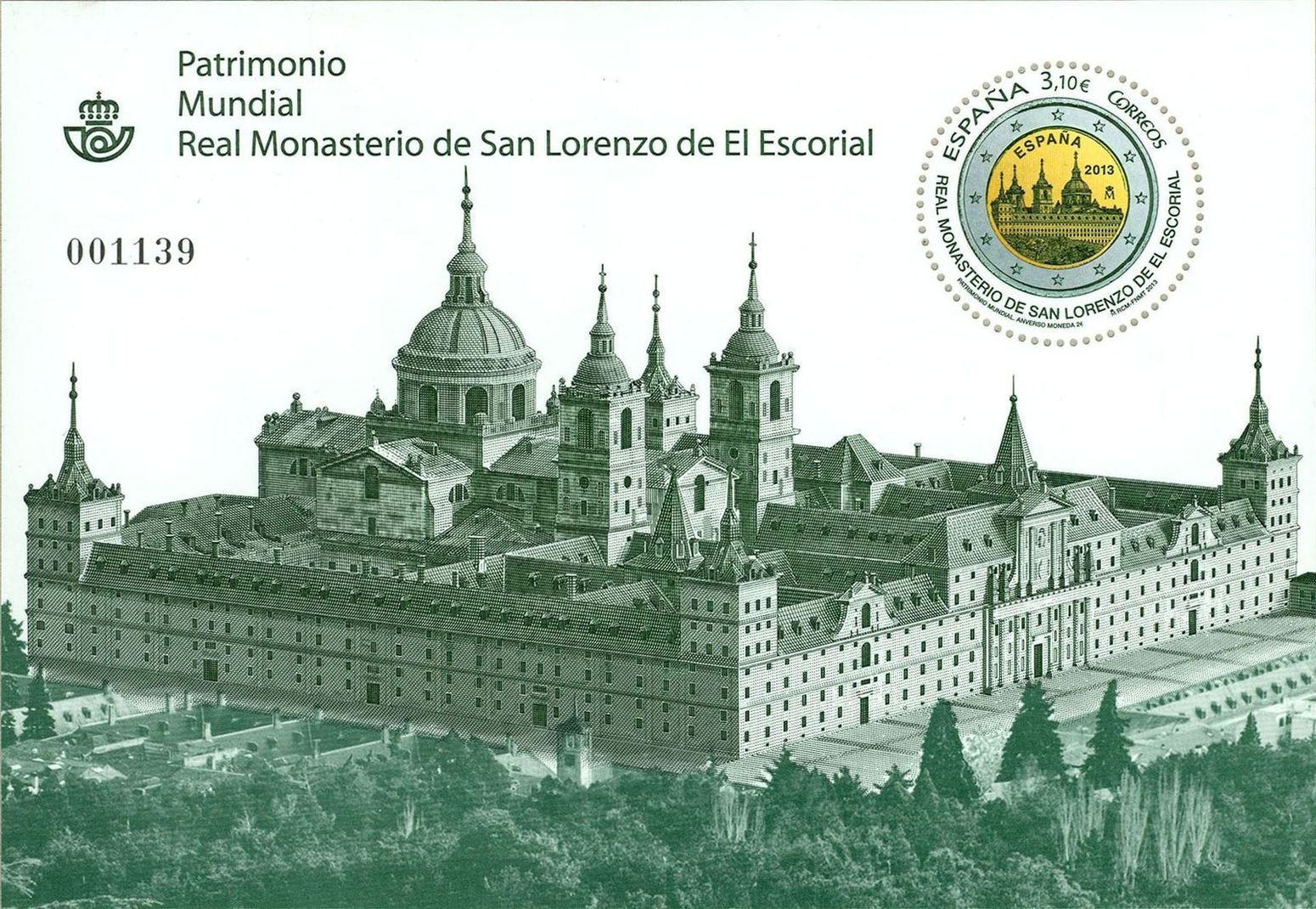 El sello calcográfico dedicado al Real Monasterio de San Lorenzo de El Escorial, de la serie Patrimonio, emitido el 21 de Marzo del 2013, es el primero, entre 22 países participantes, de su categoría. El Real Monasterio de San Lorenzo del Escorial fue declarado Patrimonio Mundial de la Humanidad por la Unesco, en 1984. En la hoja bloque que forma esta emisión se reproduce una vista general del conjunto monumental y en el sello la moneda conmemorativa dedicada al Real Monasterio.