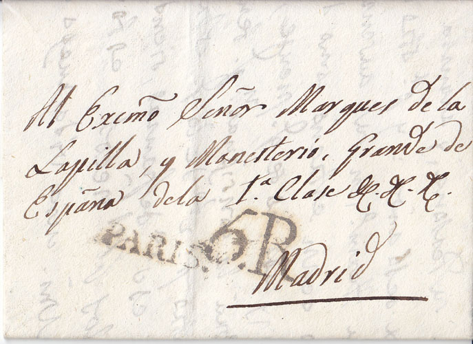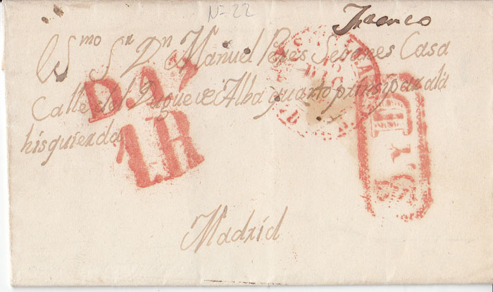 El destinatario es diputado a Cortes o senador, aunque el remitente no lo especifica y escribe sus señas particulares. Una vez en Madrid le imponen el importe a pagar de 1 real, pero alguien repara en el dato (tal vez por aclaración del propio destinatario) y se escribe Franco (los senadores y diputados, durante el periodo de sesiones, estaban exentos de pagar por el correo recibido) y se estampa la marca de Senadores y Diputados.