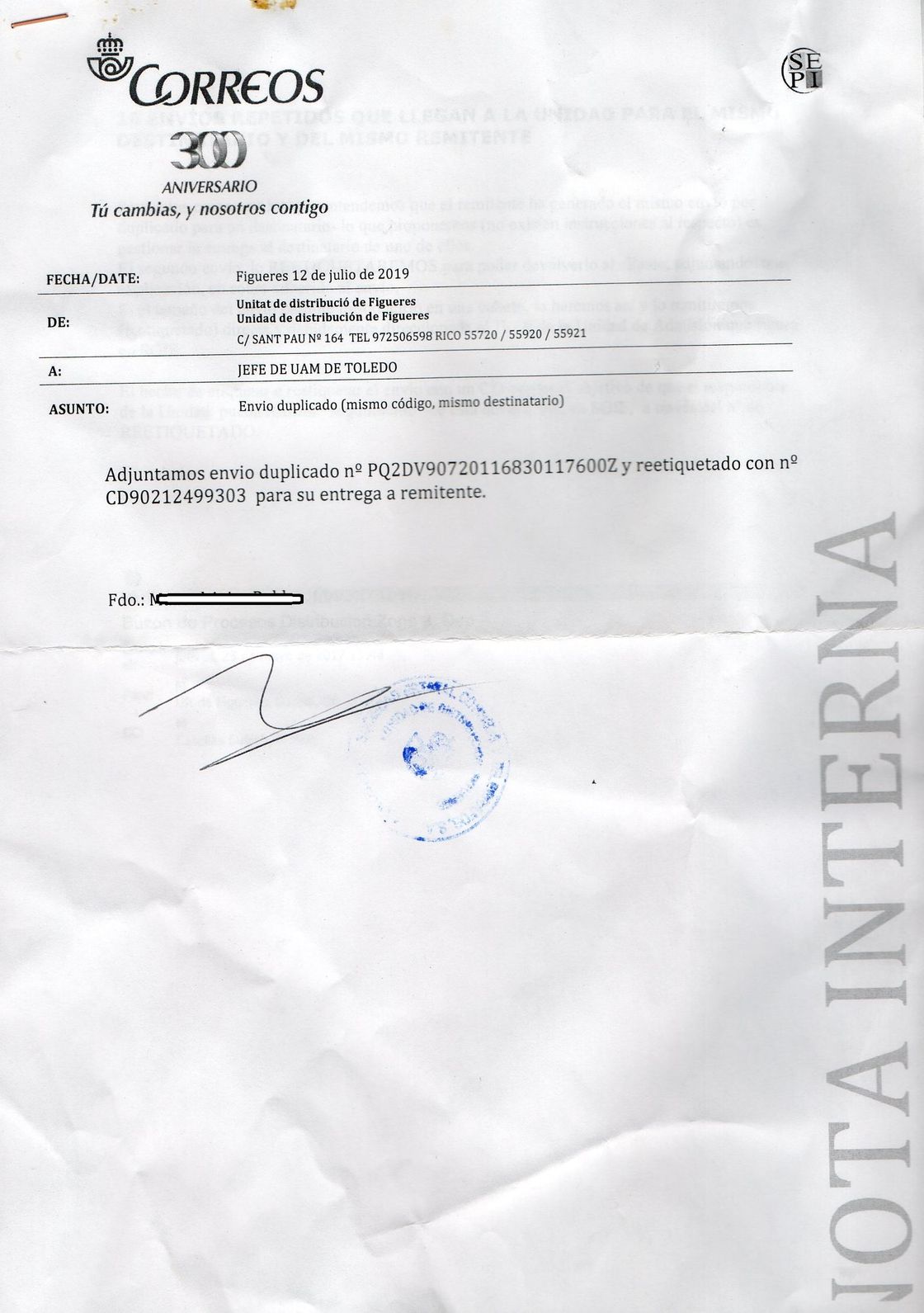 1964 escribió: 01 Abr 2019, 23:51 CORREOS Y TELEGRAFOS, S.A. / SEVILLA / 26 de febrero de 2019 / Control de NotificacionesSERVICIO INTERNO DE CORREOS (32).jpgSERVICIO INTERNO DE CORREOS (33).jpg