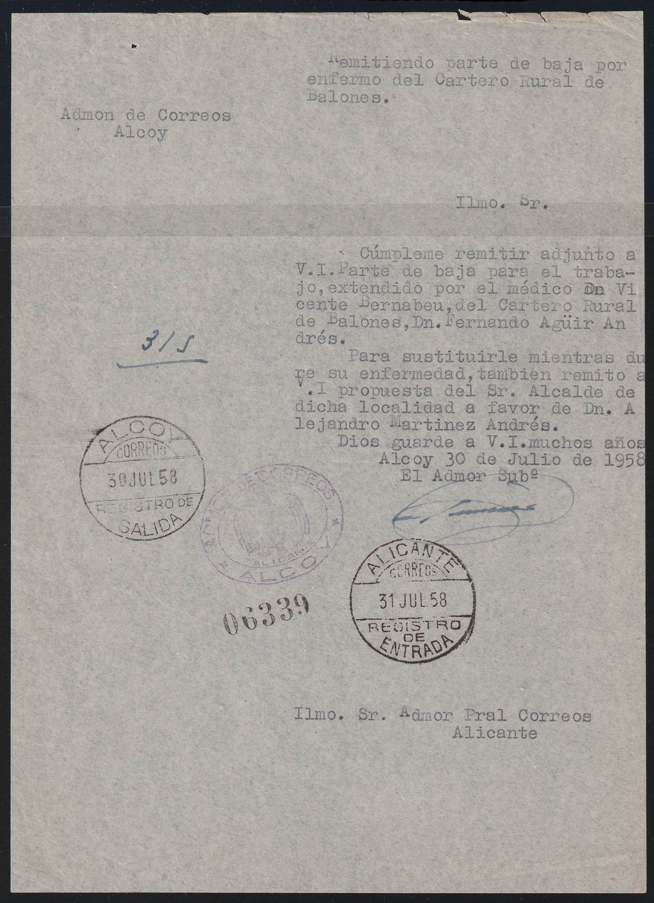 Documento interno entre las oficinas de Alcoy y Alicante.