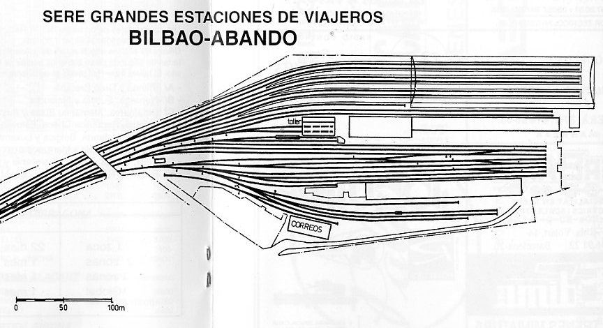 Este plano de la estación Bilbao-Abando, antigua Estación del Norte, hoy Abando Indalecio Prieto, aparecía en el boletín nº 81/1999 de la ASAFER, Associació d'Amics del Ferrocarril de Manresa, y su autor es Pedro Pintado, aficionado al ferrocarril al que debemos gran cantidad de planos de estaciones entre otros dibujos ferroviarios.