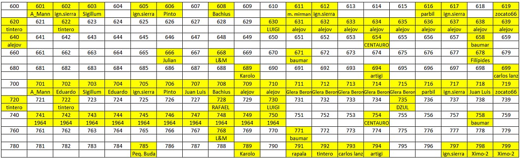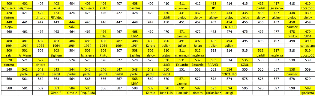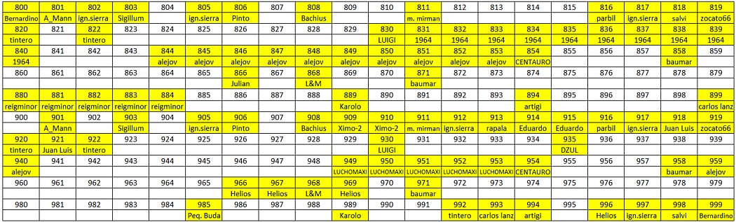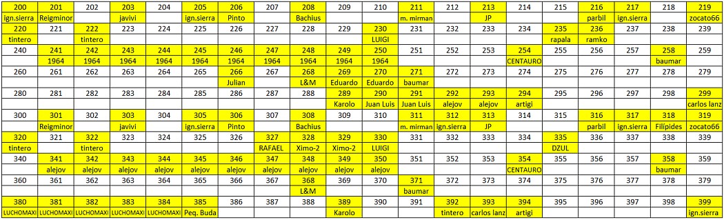DJED escribió:ruego al apuntador, me apunte, todos los números que estén libres en este momento y comprendidos entre el 000 y el 100, ...