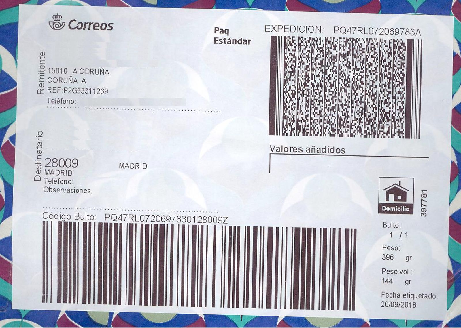 Pongo otro ejemplo de etiqueta de Correos y remitente, una encima de la otra. Quizás estén las dos preparadas por el remitente(si es así, no entiendo que haya dos etiquetas).