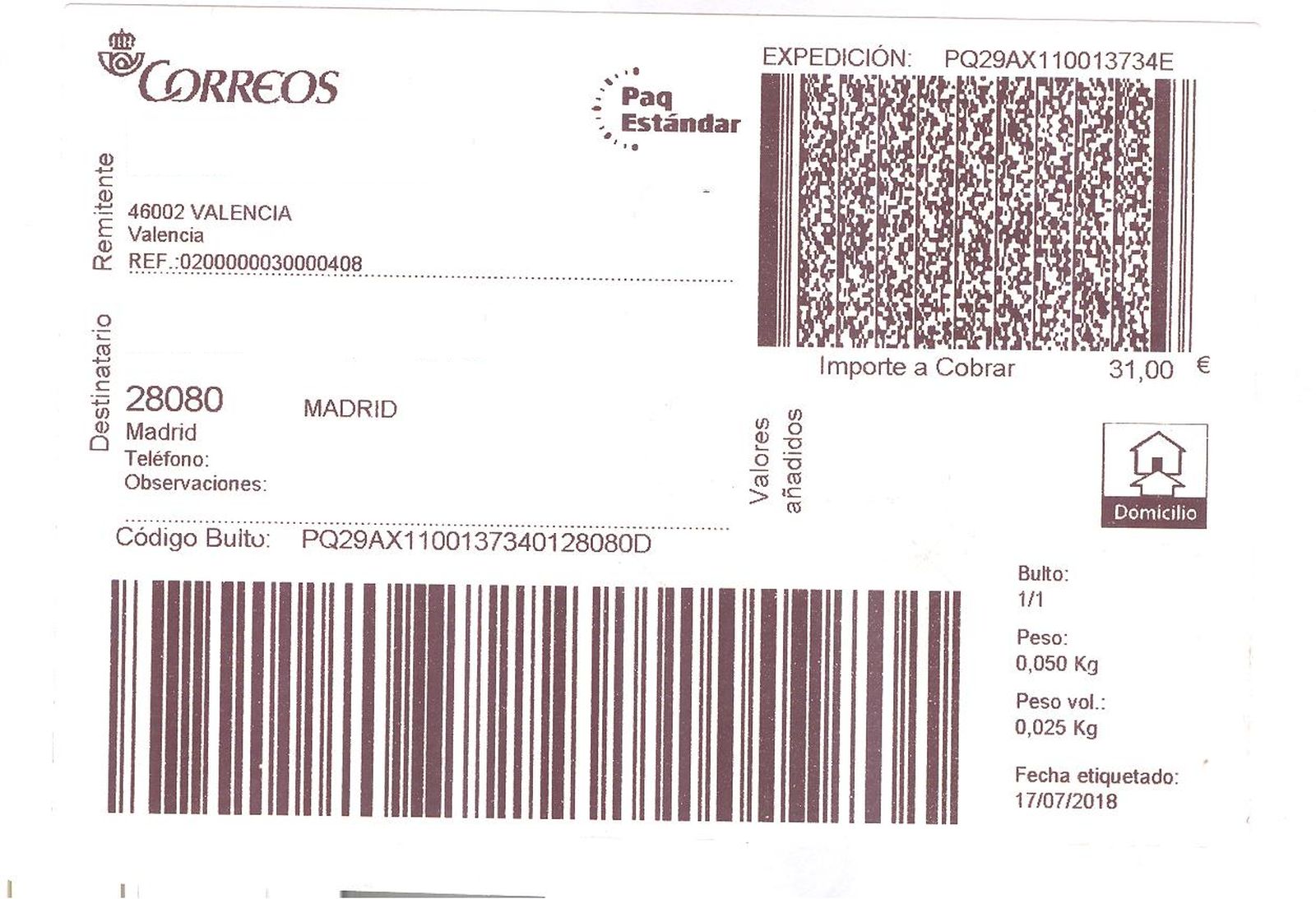 Etiqueta térmica digital. Grande. Paq. Estándar. (Valencia). Domiciio. Importe a cobrar 31,00 €. 10x14.5. 2018-07-17 (etiquetado). Baja.jpeg