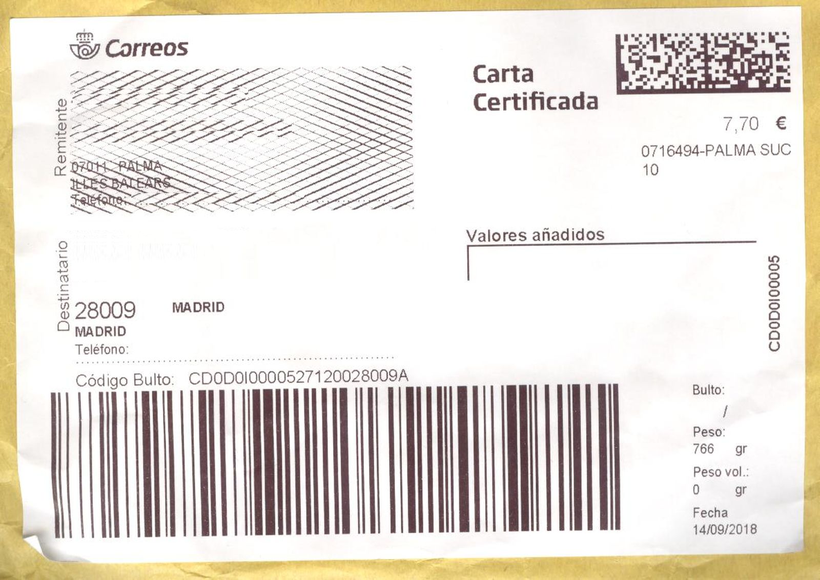 Etiqueta térmica digital. Grande. 0716494-Palma Suc 10. Código envío. Carta Certificada. 7,70 €. 10x14,6. 2018-09-14.Baja.jpeg