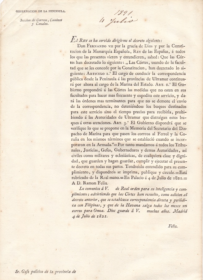 DECRETO SOBRE EL CORREO DE LA PENINSULA A LAS PROVINCIAS DE ULTRAMAR
