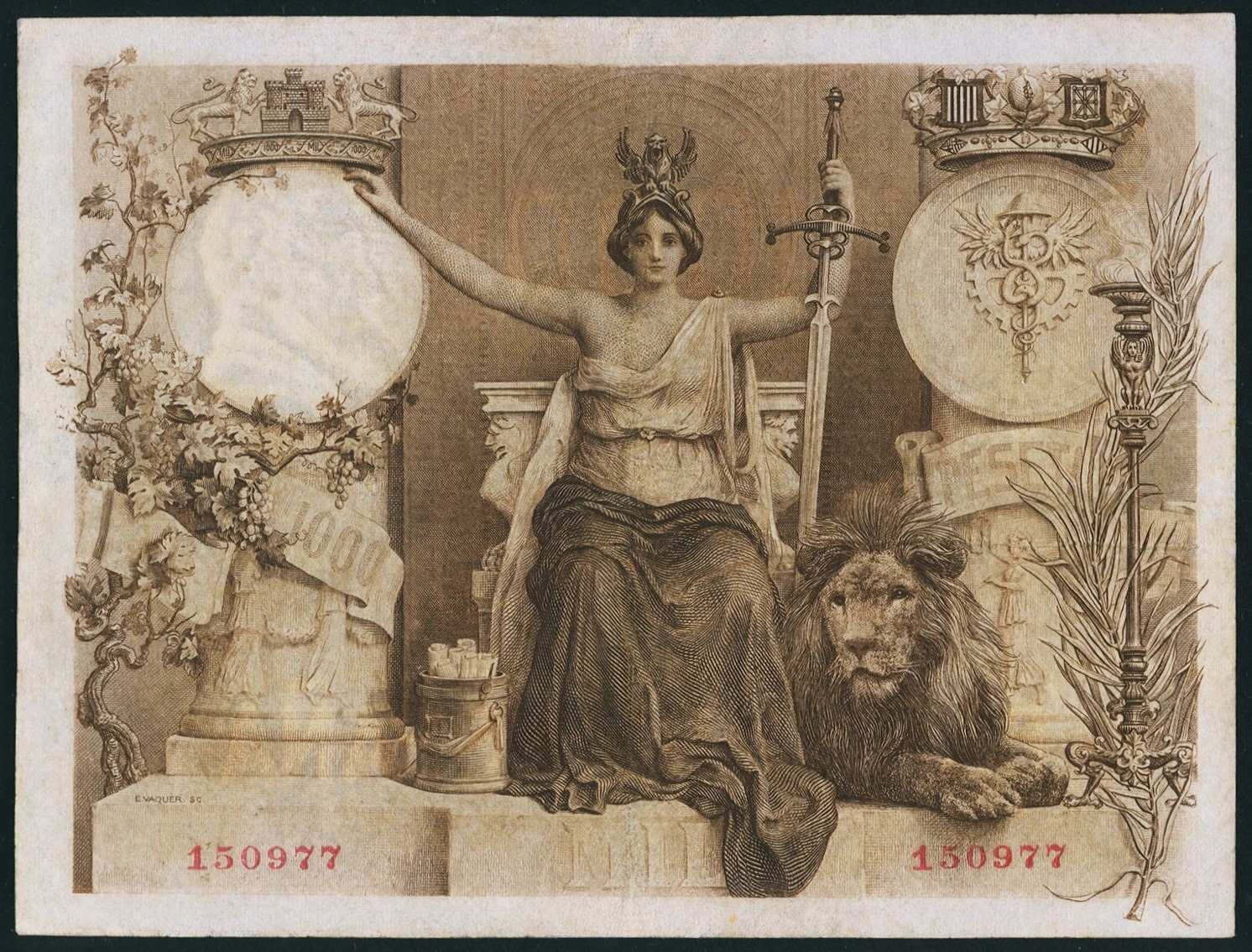 Billete de 1000 pesetas, año 1907, en el que Enrique Vaquer grabó las impresionantes viñetas alegóricas de anverso y reverso