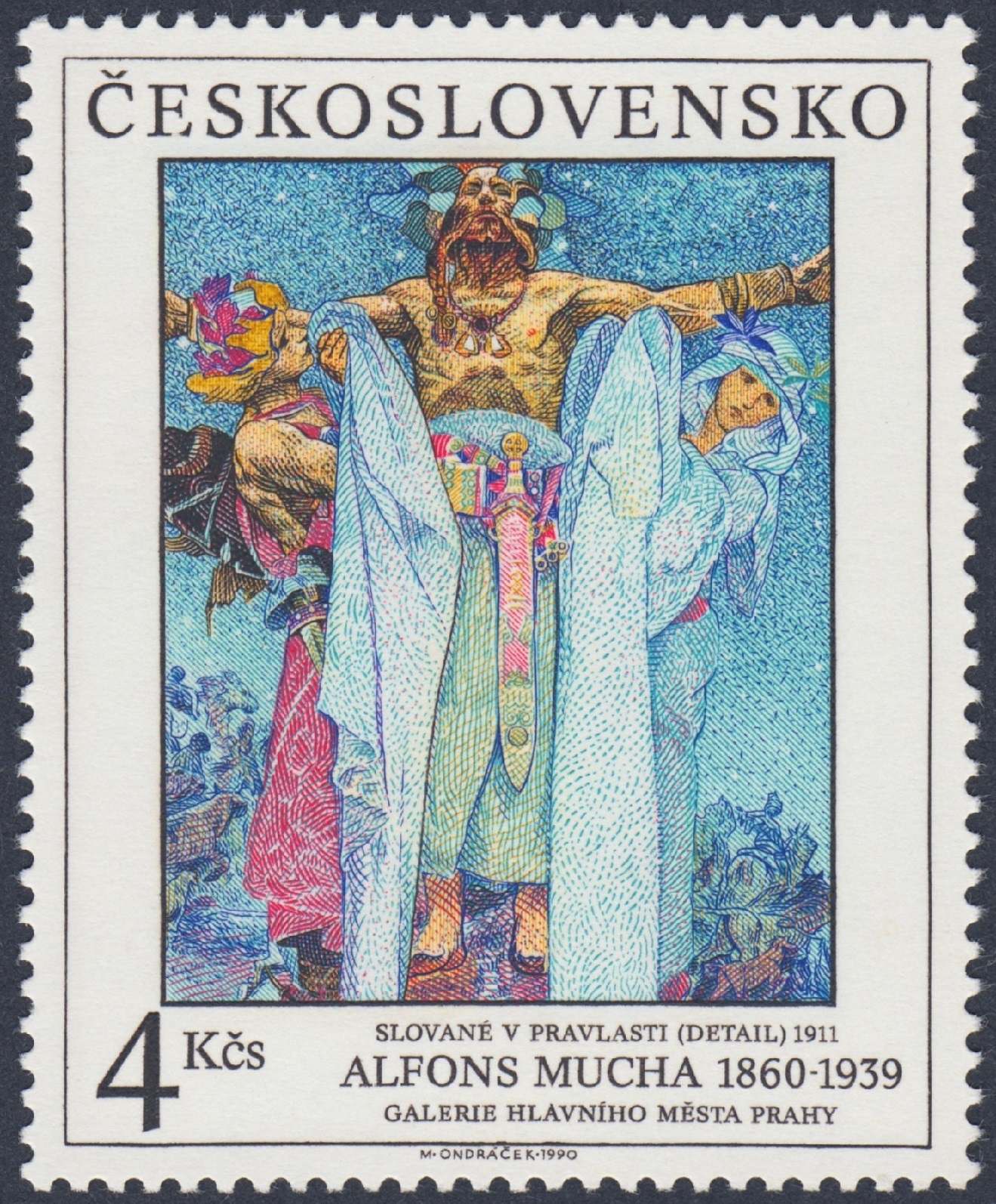 Checoslovaquia, 1990, Arte, fragmento de “Slované pravlasti”, de Alfons Mucha. Sello diseñado y grabado por Miloš Ondráček. Calcografía