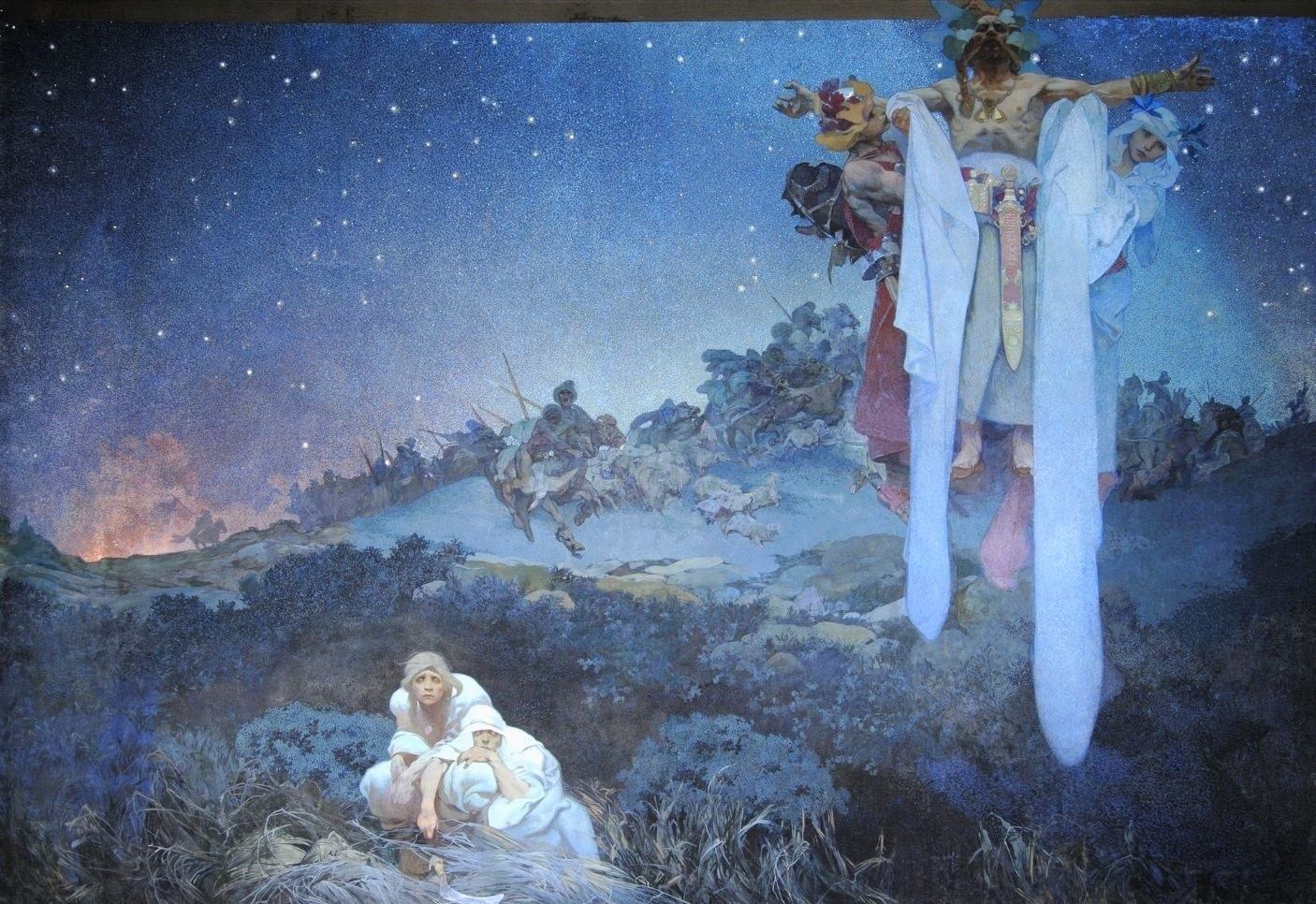 “Slované pravlasti”, pintura perteneciente al ciclo monumental de Alfons Mucha llamado Epopeya eslava, formado por 20 grandes lienzos pintados a partir de 1910 y durante casi dos décadas