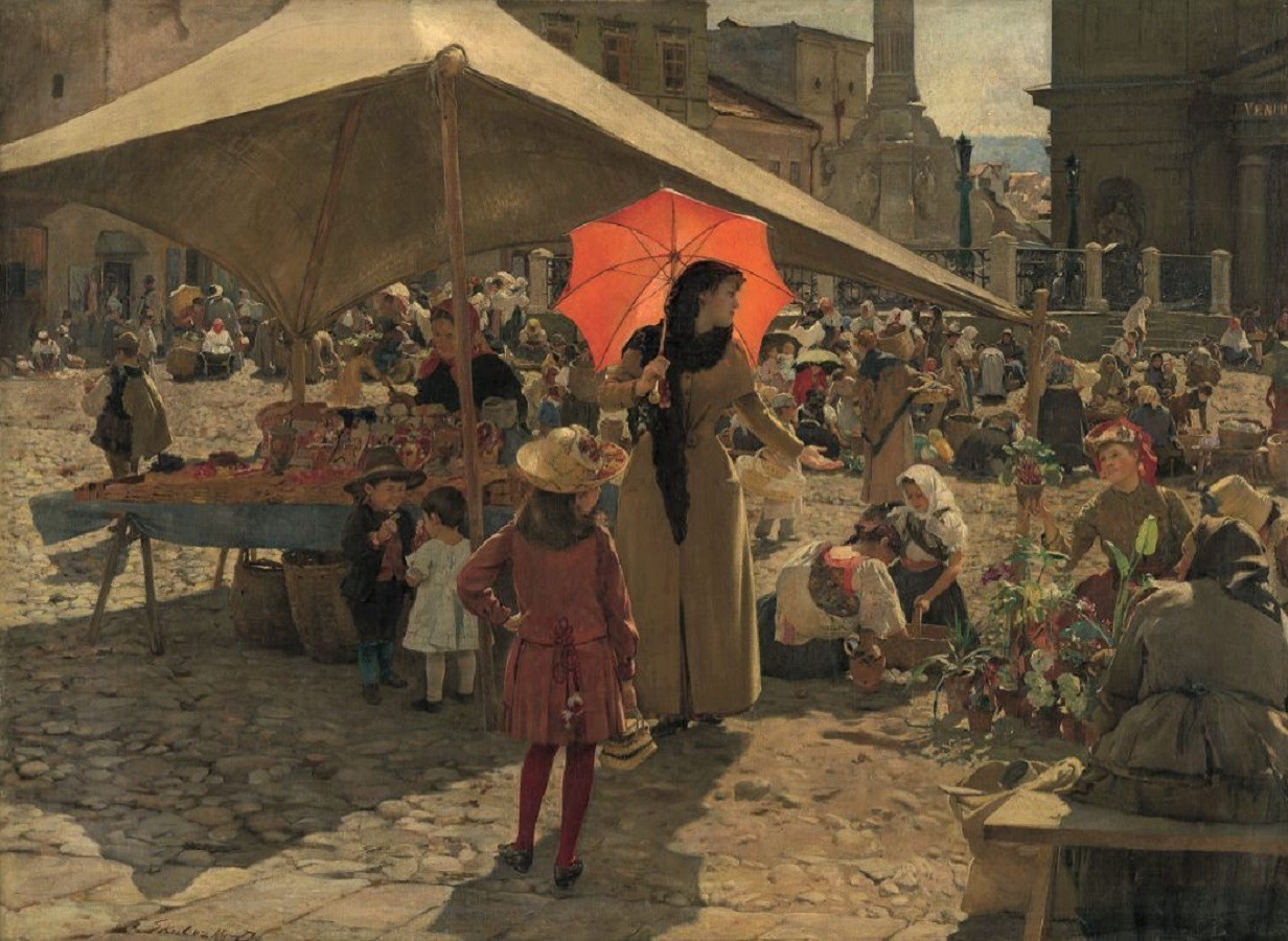 “Mercado de Banská Bystrica” (1889), pintura de Dominik Skutecký. Óleo sobre lienzo, 83.3 × 113.5 cm